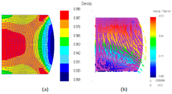 Figure 12 shows higher densities at the billet center and die interfaces post-simulation, with a lower density in the bulge area due to reduced pore closure from metal displacement. Figure 12b illustrates the metal flow from the center to the periphery, with a decreased velocity at the die–preform interface due to friction.