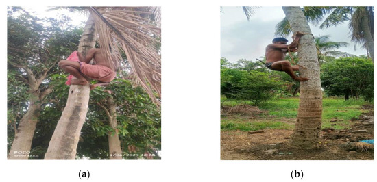 Here, fifty-six coconut farmers aged 25 to 55 years were considered for a “Musculoskeletal Disorder Problems” assessment while climbing coconut trees in Odisha (India). All the selected small-scale farmers belong to the Khordha, Nayagada, Puri, and Paradip coastal districts of Odisha. The coconut farmers and climbers have expertise of 5 to 15 years. Later, Lehmann and QEC (quick exposure check) tests were performed by “ErgoFellow 3.0” software to find out coconut farmers’ musculoskeletal discomfort level by analysing their body posture during climbing. Hence, all coconut farmers during climbing and plucking are studied. Among all workers, two workers (climbing and plucking coconut) were engaged for maximum (4 to 5) hours and around 20 to 25 trees were climbed by them every day. Hence, compared to other categories of jobs, the two workers (climbing and plucking coconuts) were observed to be carrying handwork. So, Lehmann was used to find the kcal lost by climbing and plucking (Figure 1a,b).