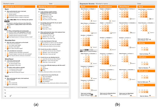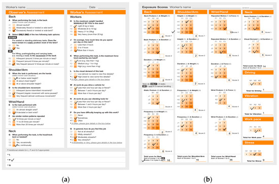 Then, further analysis is conducted by a QEC (quick exposure check) using Ergofellow 3.0 software. The QEC tool was used to analyze Figure 1a (climbing) and Figure 1b (the plucking of coconuts). Figure 2a,b shows the QEC analysis of plucking and the score of plucking and Figure 3a,b shows the results for climbing.