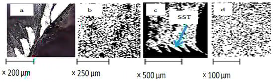Optical microstructure of surfaces (under) of chips (a) expt. no. 1, (b) expt. no. 2, (c) expt. no. 2 (SST: secondary saw tooth), and (d) expt. no. 3.