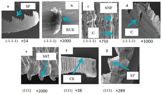 SEM images of (a) chip (under–surface) (SF: side flow), (b) BUE at the chip (under surface), (c) chip top–surface (C: crack, SNF: sinuous flow), (d) chip surface (under) (C: crack) (e) free edge of chip (SST: secondary saw tooth), (f) chip topsurface (CE: constrained edge), (g) saw-type tooth (ST: saw tooth).