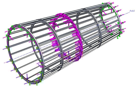 Applied loading orientations on the model in solidworks. The forces and torques are indicated by the purple-colored arrows. The arrows colored green indicate fixed geometry.
