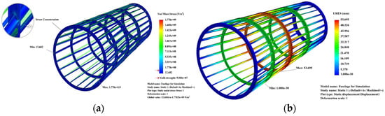 From the values obtained from static loading, it can be said that the stress is maximum at the joints, and this is minimized by using rivets for the joints. For the displacement, the reinforcement from the rivets and the skin of the fuselage would be able to reduce the displacement to a minimum (Figure 2). In the case of strain, the values are manageable.