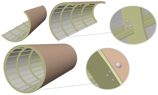 The joints between the stringers and the frames are riveted with titanium rivets and reinforced with brackets (Figure 4). The skin thickness should be equal to or greater than 1.5 times the countersink rivet depth in critical fatigue areas to avoid knife edge effects (Figure 4).