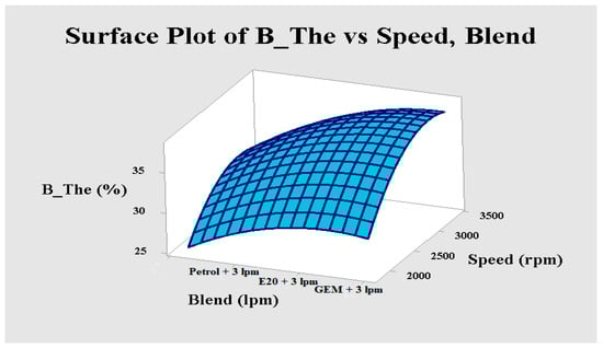 Figure 2 represents a deviation in the BTE for fuel blends and speed. It can be noticed from Figure 2 that by increasing speed, the brake thermal efficiency is enhanced. Brake thermal efficiency is also enhanced with the change in fuel blend such that, here, pure petrol + 3 lpm hydrogen, E20 + 3 lpm hydrogen, and gasoline-ethanol and methanol + 3 lpm hydrogen are used, and when compared to these three fuel blends brake thermal efficiency was highest with GEM + 3 lpm hydrogen, because GEM + 3 lpm hydrogen exhibits a higher brake thermal efficiency than the other two blends, and also with the GEM blend without hydrogen [], because the higher alcohol content caused oxidation of the blend and, therefore, the high latent heat of vaporization caused a rise in the brake power. Hydrogen’s addition to the blend fuels also increased the brake thermal efficiency due to its higher flame velocity; the ignition energy of hydrogen is low, which makes the mixture easier to ignite [].