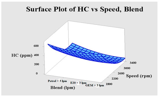 The fluctuation in HCs at different speeds and fuel blends is shown in Figure 3. Here, we can observe that HC emissions decrease slowly with fuel blends. They are highest with petrol + 3 lpm hydrogen and lowest with GEM + 3 lpm hydrogen; this is due to the quenching distance of hydrogen, which is shorter than that of ethanol and methanol, so that flame will propagate to the walls of the combustion chamber. This makes the HC emissions reduce. Hydrogen does not contain carbon and so, with the addition of hydrogen HCs, emissions decrease. Higher oxygen in the GEM blend will result in lower HCs when compared to pure petrol and E20; this is the other reason for reducing HC emissions [,].