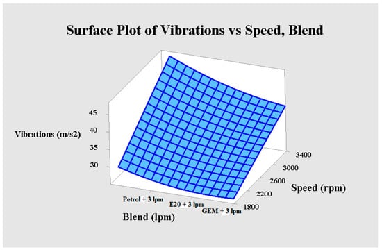 Engine vibrations are the discomfort factor for a vehicle rider at increasing speeds. Figure 4 describes the effect of vibrations concerning the speed of the engine and blend. Vibrations were raised with an increment in speed and lowered with GEM + 3 lpm hydrogen compared to the other two blends due to the higher oxygen content in the fuel blend, and this leads to healthy combustion which, in return, improves the performance of the engine and avoids a large amount of knocking [,].