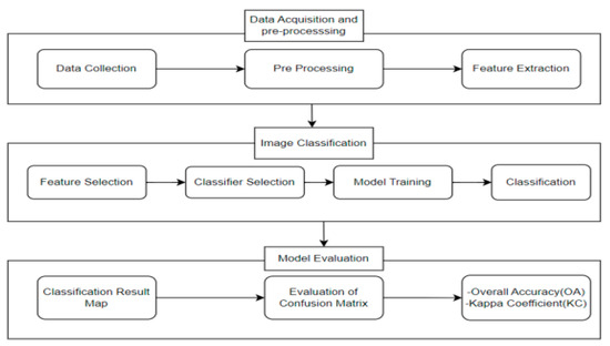 Figure 2 represents a systematic process for conducting machine learning-based crop classification. Beginning with data collection, it encompasses the acquisition of essential data. Following this, preprocessing steps are crucial to correct atmospheric influences and normalize values. Feature extraction identifies relevant attributes from the data, including the spectral bands vital for distinguishing various crop types. Feature selection reduces dimensionality and optimizes model efficiency. Classifier selection, such as Random Forest or SVM, depends on data characteristics and classification requirements. The algorithms are trained using labeled data, leading to classification. Visualizing the results on a map provides a spatial representation of the classified areas, and evaluation via a confusion matrix quantifies model performance.