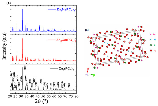 (a) XRD pattern of Zn3−xMx(PO4)2 (M=Ni, Co; x = 1) nanoparticles and (b) its structure.