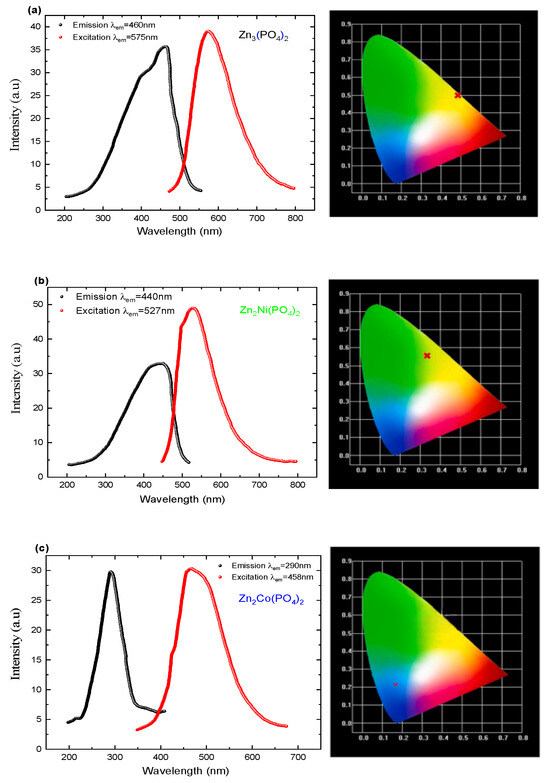 The excitation and emission spectra of (a) Zn3(PO4)2; (b) Zn2Ni(PO4)2; (c) Zn2Co(PO4)2 the corresponding emission colors in the CIE chromaticity diagram.