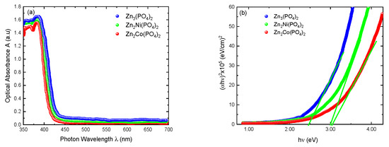 (a) The optical absorption spectra and (b) The (αhν)2 as a function of photon energy hν of Zn3−xMx(PO4)2 (M=Ni, Co; x = 1) nanoparticles.