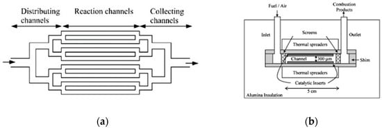 (a) Fluid and heat flow in a single-phase microreactor. (b) Single-phase microreactor structure.