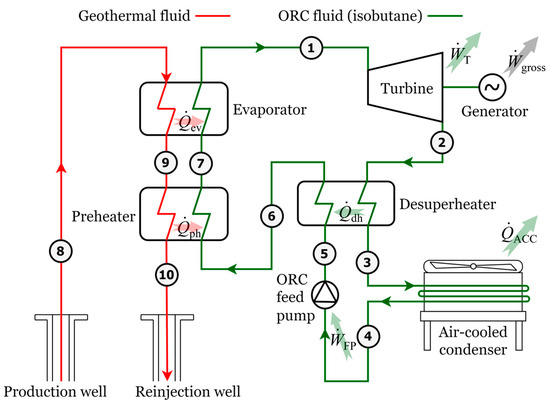 The geothermal power plant is modeled as an Organic Rankine Cycle (ORC) single-stage configuration using isobutane as the working fluid. The geothermal fluid flows from the production well, with a temperature of 160 °C, a pressure of 25 bar, and a mass flow rate of 225 kg/s (state ⑧). Thermal energy is transferred to isobutane in the preheater, ⑨ → ⑩, and evaporator, ⑧ → ⑨, as shown in Figure 1. Isobutane flows in a closed loop and runs the ORC turbine, ① → ②. Isobutane condenses inside the air-cooled condenser, ③ → ④. The ORC feed pump ensures the pressure difference in the isobutane circuit, ④ → ⑤. The desuperheater recovers the sensible heat content, ⑤ → ⑥, from the exhaust vapor of the turbine, ② → ③. This is because, unlike water vapor, isobutane is a dry working fluid, and its expansion ends in the superheated region.
