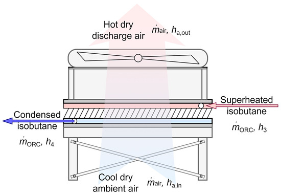 Unlike wet cooling towers, which rely on sensible and latent heat exchange (evaporative cooling), dry cooling towers or air-cooled condensers rely solely on sensible heat transfer. Consequently, ACCs are typically less efficient, of bigger size, and occupy more land area than wet cooling towers. However, ACCs do not require a dedicated source of fresh make-up water to replace evaporative losses from the tower. This makes them the preferred option in regions with limited water availability and cold climates. In regions with cold winters, wet cooling towers need to be equipped with electric heaters, additional thermal insulation, and antifreeze additives to prevent freezing problems and power-plant shut-downs. The heat-balance equation between isobutane and air is given with Equation (4), while the heat transfer equation of the ACC is: