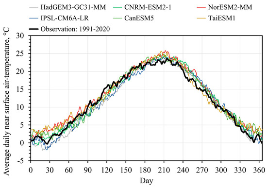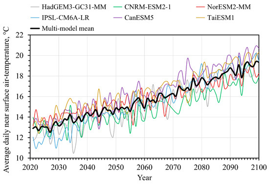 The weighted method is considered a good representation of the true daily average air temperature and provides superior accuracy to values obtained by averaging maximum and minimum air temperatures or those obtained using other methods [35]. On the other hand, CMIP6 climate models calculate maximum, minimum, and average daily air temperatures on a daily or monthly basis, that is with a time step of 1 day or 1 month. Only climate models with a time step of 1 day were considered in the present study.
