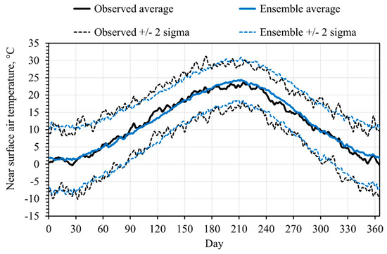 Multiple climate models can be combined together into ensembles, which are expected to perform better than individual climate models. In the present study, the multi-model ensemble is built using the six best-performing climate models. Figure 4 compares the multi-model prediction (blue lines) with the observed temperature data (black lines). Data dispersion is represented by two standard deviations around the mean (±2 sigma), which encompass 95.45% of the data under the normality assumption. Relative to the individual climate models, the multi-model ensemble increases the prediction accuracy. The RMSE of the multi-model is 1.130 °C, while the average RMSE of the top-six climate models is 1.547 °C.