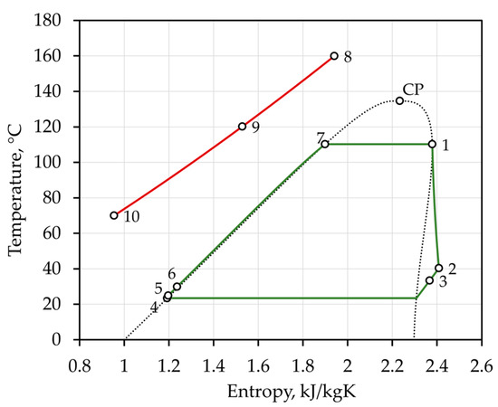 Figure 6 shows the temperature-entropy chart of the single-stage ORC configuration (Figure 1). For an ambient air temperature of 12 °C, which is the average for 1991–2020 in Bjelovar, a geothermal fluid inlet temperature of 160 °C, and a mass flow rate of 225 kg/s (810 t/h), the gross and the net powers are 12.2 MW and 10 MW, respectively. The gross and the net thermal efficiencies of the single-stage ORC configuration are 14.3% and 11.6%, respectively. The LCOE is 79.2 USD/MWh and the SIC is 5400 USD/kW.