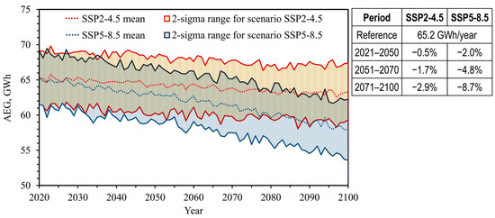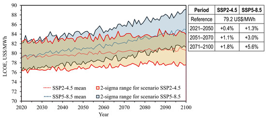 Figure 7 and Figure 8 show the annual electricity generation (AEG) and the LCOE in the observed geothermal power plant, as predicted by the multi-model mean, along with the two-sigma ranges (95.45% interval certainty). The analysis involves short-term (2021–2050), medium-term (2051–2070), and long-term (2071–2100) projections. The AEG of geothermal power is expected to decline between 0.5% and 2.9% in the intermediate climate-change scenario (SSP2-4.5) and between 2.0% and 8.7% in the extreme scenario (SSP5-8.5). The LCOE will increase between 0.4% and 1.8% in the intermediate scenario and from 1.3% to 5.6% in the extreme scenario.