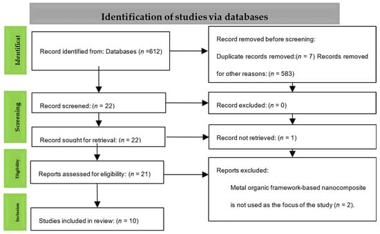 The Preferred Reporting Items for Systematic reviews and Meta-Analyses (PRISMA) framework was also used to determine the search strategy and assess the quality of the studies, as shown in Figure 2. A comprehensive screening process was conducted to guarantee that only pertinent and significant publications were included in this study. A total of 612 papers were discovered from internet databases. An initial screening was conducted using the keywords ‘metal organic framework’, ‘photocatalytic degradation’, ‘nanocomposite’, and ‘pharmaceuticals’. Duplicate publications were manually excluded from the database, as well as those that did not include significant information on the specified topic. Two papers were removed from this retrieval procedure (n = 2). The final assessment of eligibility was carried out by individually examining the abstracts of the screened papers. Ten papers were considered ineligible and hence excluded. The reason for this is that four papers did not explicitly utilize metal organic framework (MOF) as the nanocomposites for the degradation of pharmaceutical pollutants. Additionally, six journal articles solely presented the recent progress on metal organic framework without providing the study’s results. To select the appropriate papers, several factors were considered, including the presence of pharmaceutical pollutants, the utilization of metal organic framework as a nanocomposite, synthesis process, the light source, and the effectiveness and duration of degradation.