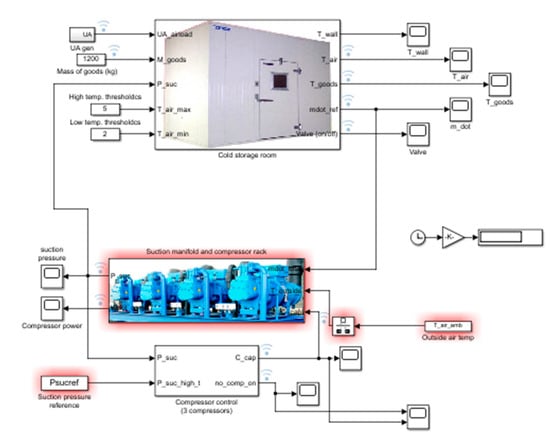 Over the decades, models for refrigeration systems have been examined [7]. Control system design may become unfeasible due to the fact that analytical modeling for refrigeration processes typically results in a large number of equations with several unknown factors. One suggestion is to construct a discrete nonlinear model from dynamic input and output data using system identification. Four primary subsystems make up a supermarket refrigeration system model: the compressor rack, the condenser, the suction manifold, the expansion valve, and the evaporator of the display cases [8,9]. Afterwards, these separate models are integrated to simulate an entire commercial refrigeration system, facilitating the efficient testing of various system configurations.