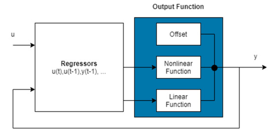 An output function and model regressors make up a nonlinear ARX model. For every model output, the output functions include one or more mapping objects. A linear function and a nonlinear function that act on the model regressors to produce the model output and a fixed offset for that output can be included in each mapping object. The construction of a single-output nonlinear ARX model in a simulation scenario is shown in this block diagram (Figure 2).