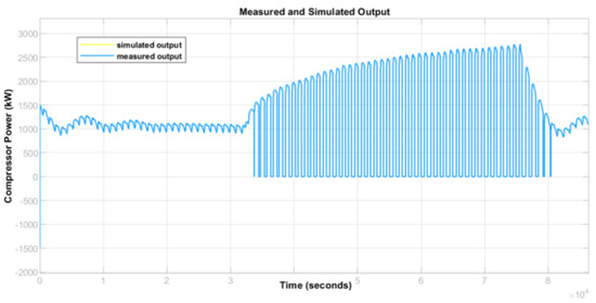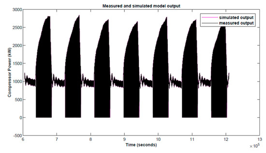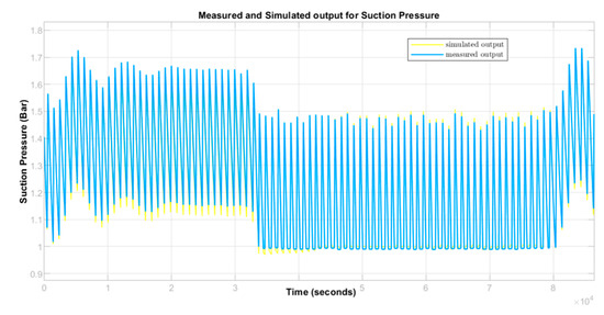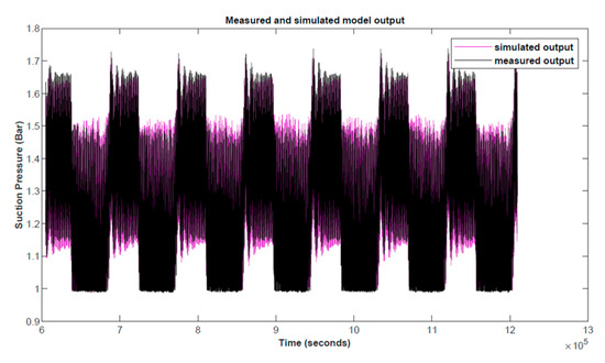 The suction manifold model has two outputs: the suction pressure and the compressor’s power consumption; and it has three inputs: the mass flow of refrigerant, the ambient temperature, and the compressor capacity. A fourteen-day simulation was carried out, and synthetic data were generated from the input and output data of the simulation model. The data for the first 7 days with 120,960 samples sampled at 5 s were used for estimation while the data for the last 7 days with 120,961 samples sampled at 5 s were used for validation. Wavelet networks were then utilized to estimate and validate a nonlinear ARX model. The number of wavelets selected for the two outputs is 2 and 20. The prediction error method (PEM) was employed for estimation, Akaike’s final prediction error (FPE) for the developed model was 1.277 × 10−16, and the mean-square error (MSE) for the model was 0.0005913 with simulation focus.
