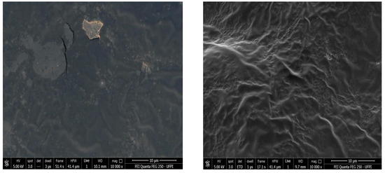 The biofilms produced with cassava starch were micrographed by SEM to evaluate the continuity of the filmogenic layer in its entirety. In Figure 1, it is possible to verify the microscopy of the control film sample without the addition of reinforcement composites and the micrograph of the starch film sample with sugarcane fiber reinforcement (Figure S3).