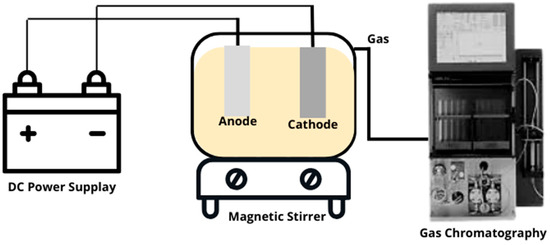 The process of electrocoagulation was carried out in an acrylic reactor with dimensions of 11 × 5 × 12 cm (length × width × height). Plat Al and SS-316 were used as the anode and the cathode, respectively. The anode and cathode had active surfaces of 4 cm × 8 cm × 1 mm, with a distance of 3 cm. A power supply (Zhaoxin RXN-605D, 60 V, 5 A, ZHAOXIN, Shenzhen, China) was used to control the current in the process. The schematic diagram is shown in Figure 1.