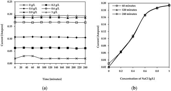 (a) Current vs. time, and (b) current vs. NaCl concentration.