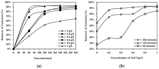 (a) Percent removal of tartrazine vs. time, and (b) percent removal of tartrazine vs. NaCl concentration.