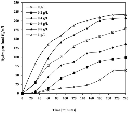 The quantity of H2 gas produced in the reaction was measured using a Shimadzu GC-8A gas chromatography system, which included a molecular sieve (MS) hydrogen 5A column. Argon was used as a known gas carrier with retention time as a reference. The H2 sample was collected every 30 min (0, 30, 60, 90, 120, 150, 180, 210, and 240 min) using a 1 mL gastight syringe.