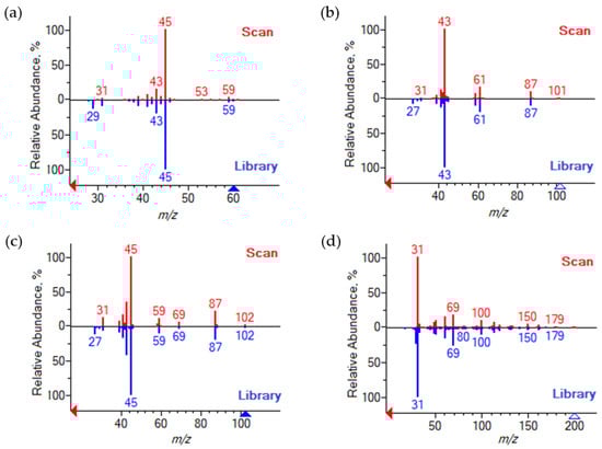 NIST library spectrum matching (red—experimental spectrum; blue—library spectrum): (a) Isopropanol; (b) Isopropyl acetate; (c) Di-isopropyl ether; (d) 2,2,3,3,4,4,4-heptafluorobutanol.
