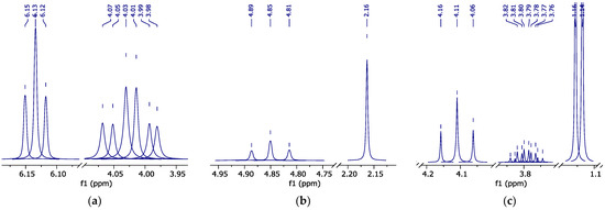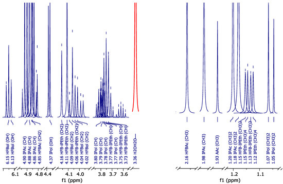 1H NMR spectrum (peak curves): (a)—pure HFBol in d-DMSO; (b)—pure HFBAc in d-DMSO; and (c)—HFB-iPEth spectrum in d-DMSO isolated from 1H NMR spectrum of the reaction mixture sample.