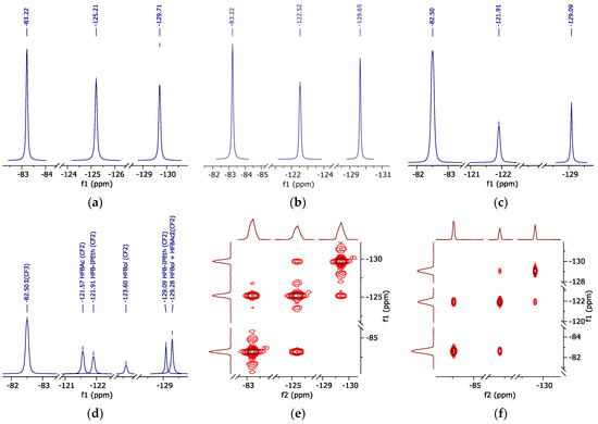 19F NMR spectrum (peak curves). (a)—pure HFBol; (b)—pure HFBAc; (c)—HFB-iPEth spectrum in d-DMSO isolated from 19F NMR spectrum of the reaction mixture sample; (d)—reaction mixture sample in d-DMSO; (e)—correlation spectroscopy 19F-19F of HFBol; (f)—correlation spectroscopy 19F-19F of HFBAc.