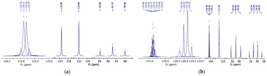 13C{19F} NMR spectrum with fluorine-19 decoupled (peak curves): (a)—pure HFBol; (b)—pure HFBAc.