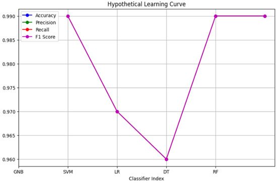 Figure 7 is called a hypothetical learning curve. In our results, all the metrics obtained are much higher for all the classifiers using the training set. We considered the classifier in the x-axis and their corresponding score is on the y-axis. On the x-axis, we show the size of the training samples of the different classifiers. When the training set size is increased then the metrics which have obtained a high value remain stable or there are slight deviations. As all the metrics provide a high accuracy, the model is a robust model that can handle volumes of data.