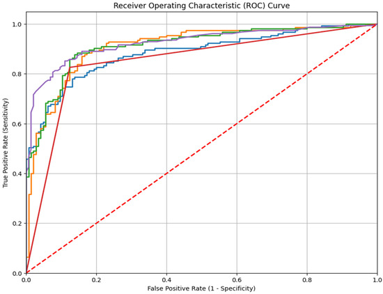 The ROC curve illustrates the trade-off between the True Positive Rate (Sensitivity) and the False Positive Rate (1 - Specificity), with each line denoting a distinct model. A model with high sensitivity and few false positives is shown by curves that approach the top-left corner. The dashed red line shows a baseline model with arbitrary predictions. When a model behaves in this manner, it has no discriminative power and is equivalent to guesswork.