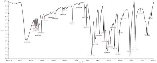 IR spectrum data of p-methoxyphenylchloroacetate (Figure 1): 3452.17 cm−1 in the strong–medium-intensity absorption region, with valence vibrations characteristic of an acetyl group at 3112.37, 3072.9, and 3011.65 cm−1. The valence vibration characteristics of the C-H group in the aromatic ring in the medium–weak intensity absorption region were 1598.03, 1509.24, 1455.96, 1465.40, 1441.33, and 1410.82 cm−1. The specific valence vibrations in the aromatic ring in the moderate–weak absorption region of the C=C group were 947.85, 922.51, 826.57, 769.65, 769.83, and 709.45. The deformational vibration characteristics of the C=O group in the absorption region was 1759.51 cm−1. The valence vibration characteristic of the C-O group in the medium–weak absorption region was 1054.80 cm−1. In the average absorption region of 522.68 cm−1, a vibration characteristic of the C-Cl group was observed.