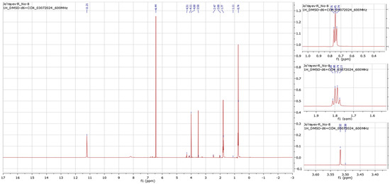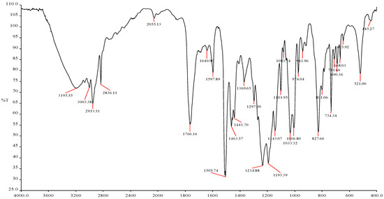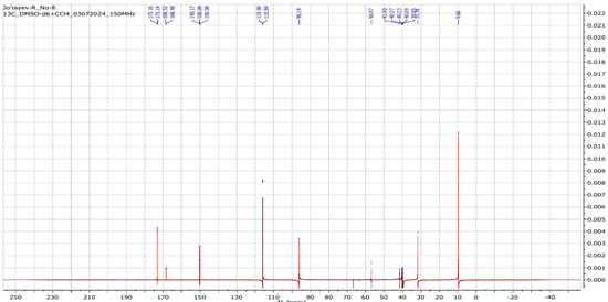 Absorption lines can be clearly seen in the intensity region of 1790–1720 cm−1 of the valence vibration of the carbonyl group of the synthesized substances (νC=O). Valence vibrations of the ether bond (νC-O-C) were 1240–1190 cm−1, and absorption lines with intensity in the middle region were formed. Two adjacent CH groups in the aromatic ring (1,4-substitutions) gave a vibrational line in the weak region of 1125–1090 cm−1.