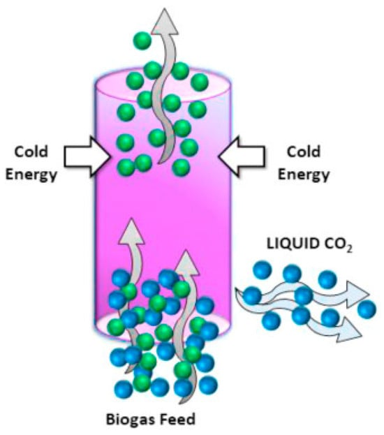 To achieve effective liquefaction of the different gaseous components, the feed gas is typically compressed to pressures ranging from 18 to 30 bars and then cooled to temperatures between −45 to −59 degrees Celsius using heat exchangers. Notably, at these higher pressures, CO2 does not sublimate, allowing for efficient separation. Once liquefied, methane can be effectively separated from gaseous oxygen and nitrogen, capitalizing on the variations in component volatility and their respective distillation properties. Overall, while cryogenic separation presents several advantages for upgrading biogas and natural gas sweetening, its operational costs and risks require careful consideration and management [].