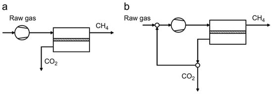 Single-stage membrane-based biogas upgrading process. Process (a) the permeate flows to the ambient. Process (b) the permeate is partially recycled to enhance the CH4 recovery. Reprinted with permission from []. Copyright The Royal Society of Chemistry.