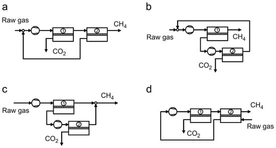 Two-stage gas permeation process for biogas upgrading. Process (a) only needs one compressor and recycles the permeate of the second step. Process (b) needs two compressors and recycles the retentate of the second step. In Process (c), two compressors are needed, and the retentate of the second step is mixed with the one coming from the first step. In process (d), the feed gas is used as a sweep gas on the permeate side of the second module. Reprinted with permission from []. Copyright The Royal Society of Chemistry.