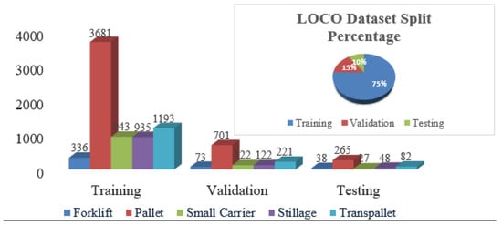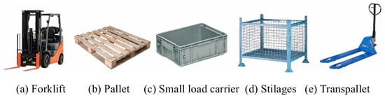 In this work, we used the Logistics Objects in Context (LOCO) dataset, a publicly available dataset that depicts logistics objects in realistic logistics scenes. In its first release, the Logistics Objects in Context (LOCO) dataset considers pallets, small load carriers, stillages (also known as lattice boxes), forklifts, and pallet trucks (illustrated in Figure 1). Images were captured while walking through a logistics setting using low-cost cameras, These objects were captured in diverse lighting conditions ranging from well-lit outdoor environments to dim indoor settings, ensuring variability and generalizability. Additionally, the dataset includes multiple occlusion scenarios where objects are partially obscured by others, making it ideal for testing the effectiveness of object detection algorithms. LOCO currently provide 37,988 images captured in 5 logistics environments, from which 5593 images were manually annotated, resulting in 152,421 annotations [].