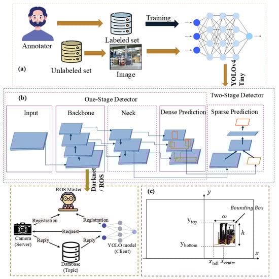 Architecture (a), training the loco dataset on the yolov4-tiny (b), and YOLOv4 Tiny structure with ROS/Darknet integration (c), detected object with corresponding bounding boxes.