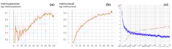 Our approach object detection metrics: evaluation graphs (a), precision (b), recall (c), the mAP, and loss over iterations.