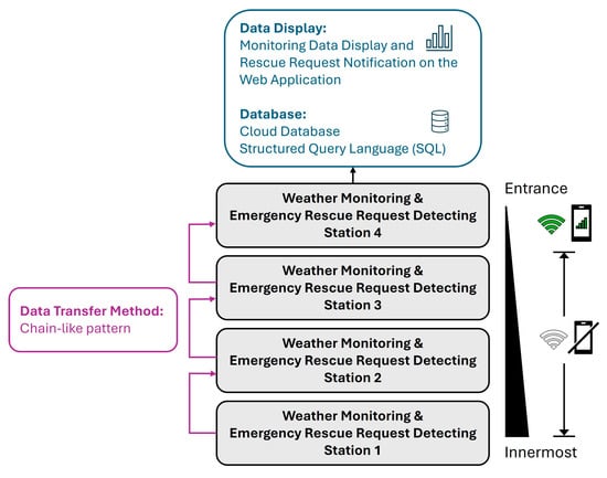 The three main components cooperating in the IoT-based system developed by this study include four individual stations for weather monitoring and emergency rescue request detecting (gray-colored filled boxes), a set of data transfer commands to transmit the data from the innermost (lack of internet Wi-Fi and cellular) to the outermost part of the cave passage (full-service access) resembling the chain-like pattern (pink-border open box), and a data display via a web application and an SQL database uploading via Cloud (blue-border open box).
