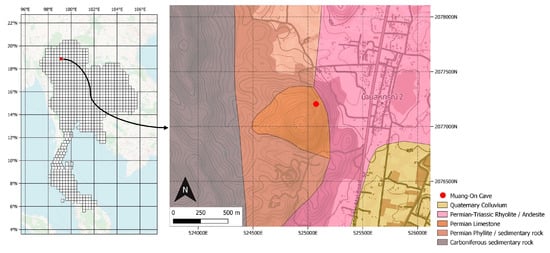 The location of Muang-On Cave is in the north of Thailand, displayed on a 1:50,000-scaled geologic map adapted from the Department of Mineral Resources [27]. A set of contour lines and the WGS84 coordinate system exhibiting the 47N UTM zone adapted from the Royal Thai Survey Department [28]. The cave is located within the Permian limestone unit, as indicated by a red-filled circle.