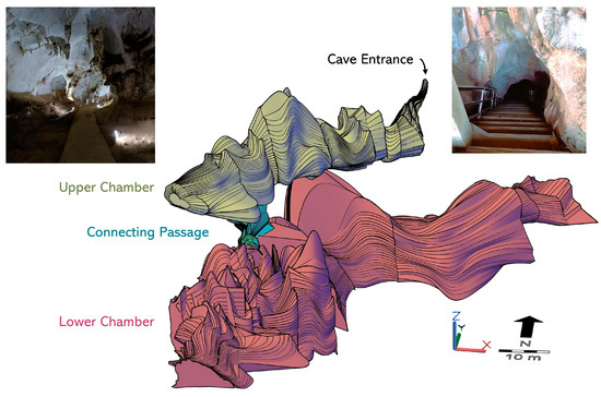 Three-dimensional cave model representing a comprehensive structure of the Muang-On Cave generated by LiDAR scanning techniques modified from Promneewat and Taksavasu (2024) [26]. The cave comprises one entrance, two horizontal chambers, and a vertical connecting passage.