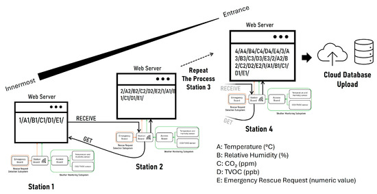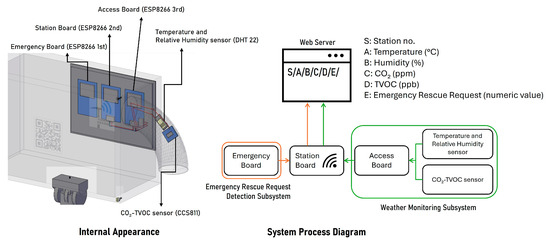 The system layout of each IoT station and its working diagram. The data obtained from the system through the microcontrollers and sensors, including station no. (S), temperature (A), humidity (B), CO2 (C), TVOCs (D), and emergency code (E), are present in the form of a text package separated by a slash displayed on a web server.