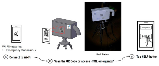 The weather data, including temperature, humidity, CO2, and TVOCs, are directly obtained from the sensor measurement, whereas the emergency rescue request signal is manually submitted by a user who is currently in the cave. The time interval for the data reading, processing, and web server refresh of each station ranges from 80 to 110 s. A detailed step for requesting an emergency rescue is shown in Figure 6.